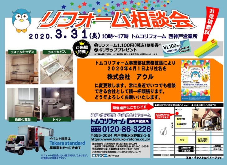 無料見積はこちら 住宅診断はこちら LINEで無料見積り・相談 HOMEイベント情報リフォーム相談会2020年3月リフォーム相談会を開催します【垂水の西神戸営業所 2020年3月31日】 2020年3月リフォーム相談会を開催します【垂水の西神戸営業所 2020年3月31日】(終了しました) 開催日時 2020年3月31日(火)10時~17時(会場:アウル西神戸営業所) 詳しくはこちら > 会場 アウル西神戸営業所 会場住所 神戸市垂水区仲田3-1-6 開催日時 2020年3月31日(火)10時~17時 一言 垂水駅から北側へ、商大筋沿いのアウル西神戸営業所でリフォーム相談会を開催します。 備考 目印は、当日限定でタカラスタンダードの展示車がとまっています♪ アクセスマップを確認する