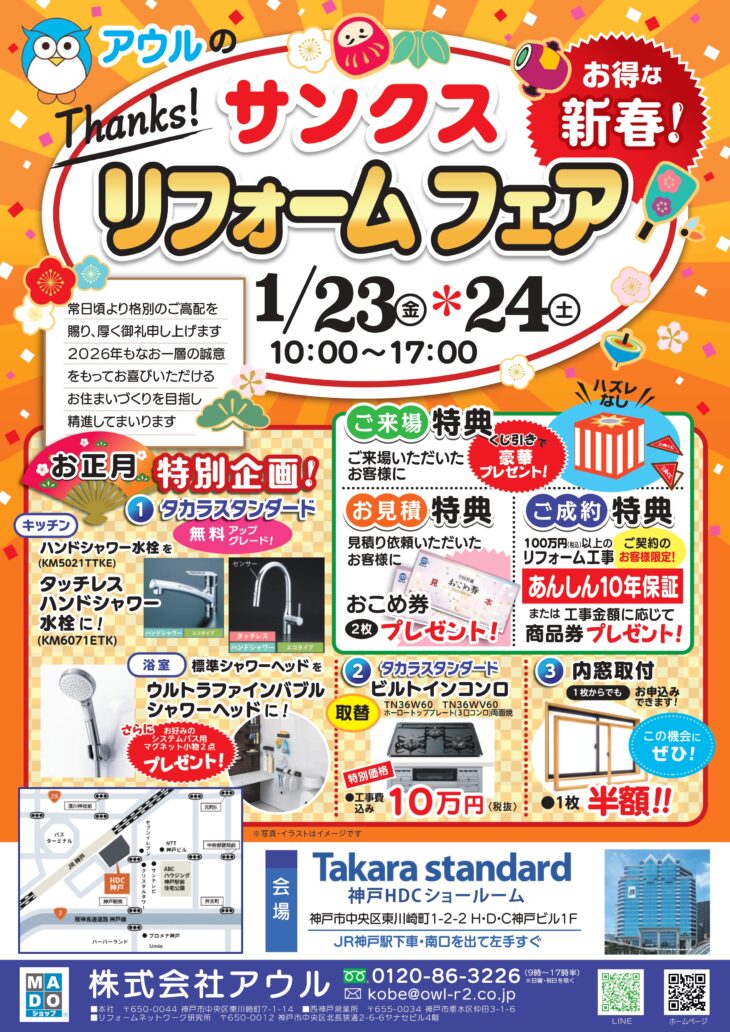 無料見積はこちら 住宅診断はこちら LINEで無料見積り・相談 HOMEイベント情報リフォーム相談会サンクスリフォームフェアを開催いたします! サンクスリフォームフェアを開催いたします! 開催日時 2026年1月23日(金)24日(土) 10時~17時(会場:HDC神戸ショールーム タカラスタンダード) 詳しくはこちら > 会場 HDC神戸ショールーム タカラスタンダード 会場住所 JR神戸線(東海道本線)神戸駅南口すぐ 1F 開催日時 2026年1月23日(金)24日(土) 10時~17時 一言 お得なお正月特別企画! 備考 https://hdc.asahi.co.jp/kobe/ アクセスマップを確認する イベントへのお申し込みはこちらから 必須お名前 例: 山田 太郎 必須電話番号 例: 078-000-0000 必須イベント名 例: 完成見学会 必須参加希望日 例: 1/1 10:00-12:00 必須参加人数 例:2名 任意メールアドレス 例: t_yamada@sample.jp 任意郵便番号 住所検索 例: 123-4567 任意住所 例:兵庫県神戸市**** 任意お問い合わせ内容 ※お急ぎの方は、 直接 0120-86-3226(9:00~17:30)まで、お電話下さい。 例:最新式のトイレにしたいです。予算は○○万円程を予定しています。工事は来月希望です。 ※相談内容は個人情報保護法に適用いたします。 24時間以内に回答を心がけておりますが、相談内容等によって、 2〜3日かかる事もございますが御了承下さい。 お電話でもお気軽にどうぞ! 内容をご確認の上、よろしければ下記の「入力内容を確認する」ボタンを押して下さい。 個人情報利用目的 ・お客様のご要望に合わせたサービスを提供させていただくための各種ご連絡。 ・お問い合わせいただいたご質問への回答のご連絡。 尚、お客様から収集する個人情報は弊社の定めるプライバシーポリシーに則って厳重に管理いたします。 プライバシーポリシー 弊社では、利用者のみなさんの個人情報がきちんと守られることを、何よりも大切にしています。また、利用者ご本人への事前の許可なしに第三者に個人情報を配送作業以外に開示することは絶対にいたしません。 どんな些細な事でも結構です。ご相談、お見積もりなど、お気軽にご連絡下さい。上記メールフォームからご連絡いただくか、電話にてご連絡下さい。 必須マークがついている項目は必ずご記載下さい。(株)、(有)や丸囲み数字等の機種依存文字は、文字化けの原因となりますので、使用しないようお願いいたします。