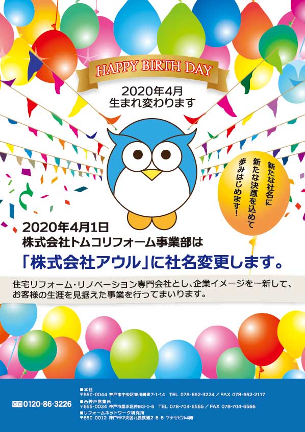 無料見積はこちら 住宅診断はこちら LINEで無料見積り・相談 HOMEイベント情報塗装セミナー・チラシ2020年4月1日 株式会社アウル事業部は株式会社アウルに社名変更します 2020年4月1日 株式会社アウル事業部は株式会社アウルに社名変更します(終了しました) 一言 2020年4月1日 株式会社アウル事業部は株式会社アウルに社名変更します