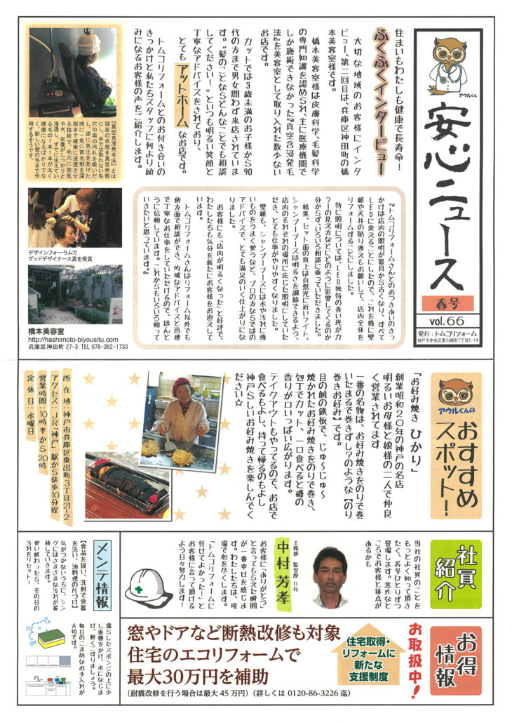 無料見積はこちら 住宅診断はこちら LINEで無料見積り・相談 HOMEイベント情報塗装セミナー・チラシ安心ニュース vol.66 春号 安心ニュース vol.66 春号(終了しました) 一言 アウルでは定期的にニュースレターを発行しております。社員の紹介や、お得情報を載せていますので、是非ご覧ください。