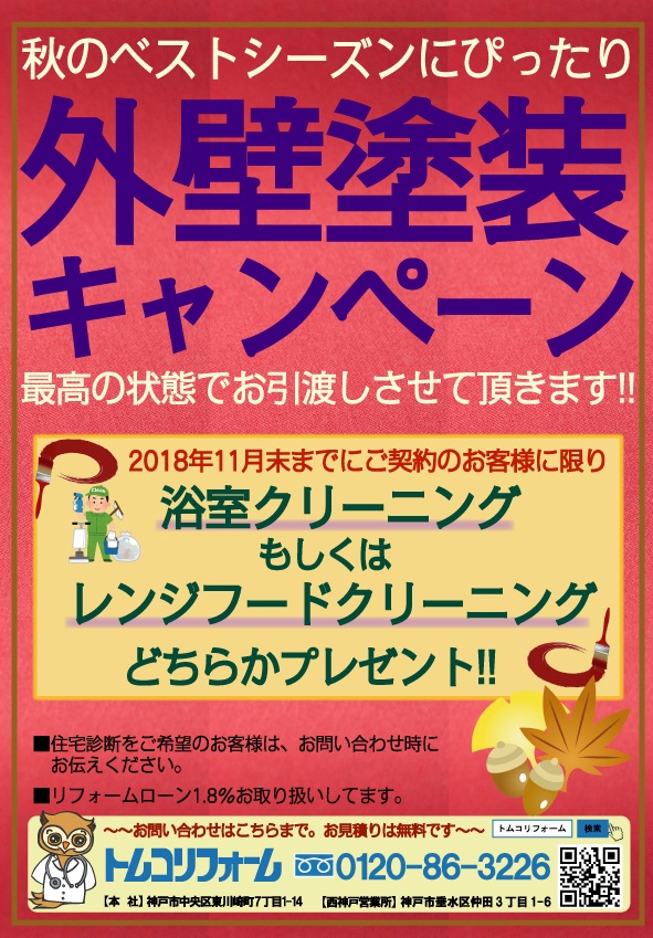 無料見積はこちら 住宅診断はこちら LINEで無料見積り・相談 HOMEイベント情報塗装セミナー・チラシ外壁塗装キャンペーン‘2018年秋 外壁塗装キャンペーン‘2018年秋(終了しました) 一言 今年も秋の外壁塗装ベストシーズンがやってきました。最高の状態でお引渡しさせて頂きます。