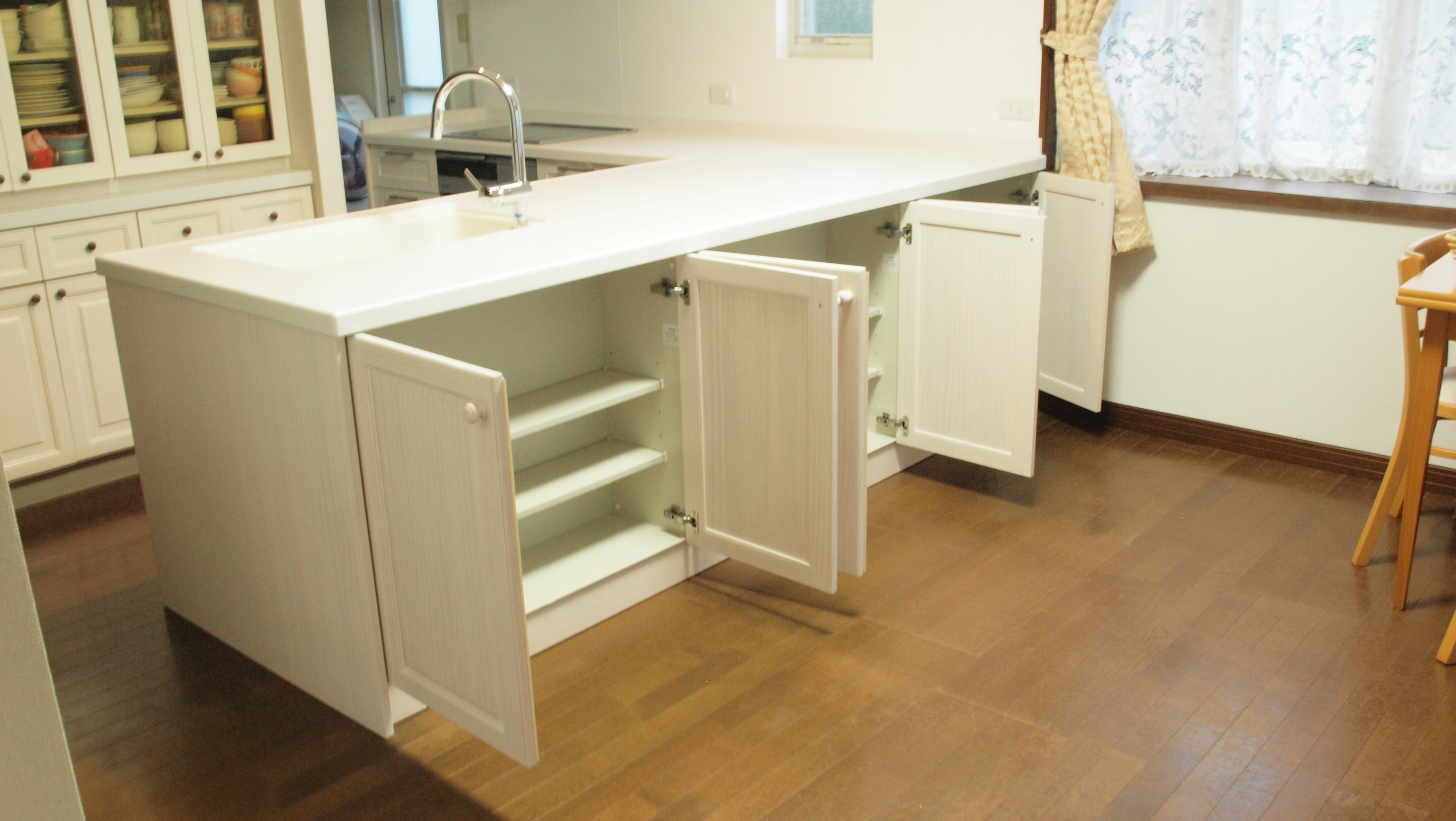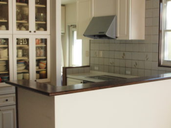 | ご提案内容 | 既存のカウンターを撤去し、L型の対面式オープンキッチンを設置しました。窓側のタイルもめくり、表面につやのあるキッチンパネルを貼ることで、油汚れもふき取りやすくなりました。お子様と、一緒に料理を作ったり、家族と会話しながら作業ができたりととっても家族の距離が近く感じられそうなキッチンです。 |