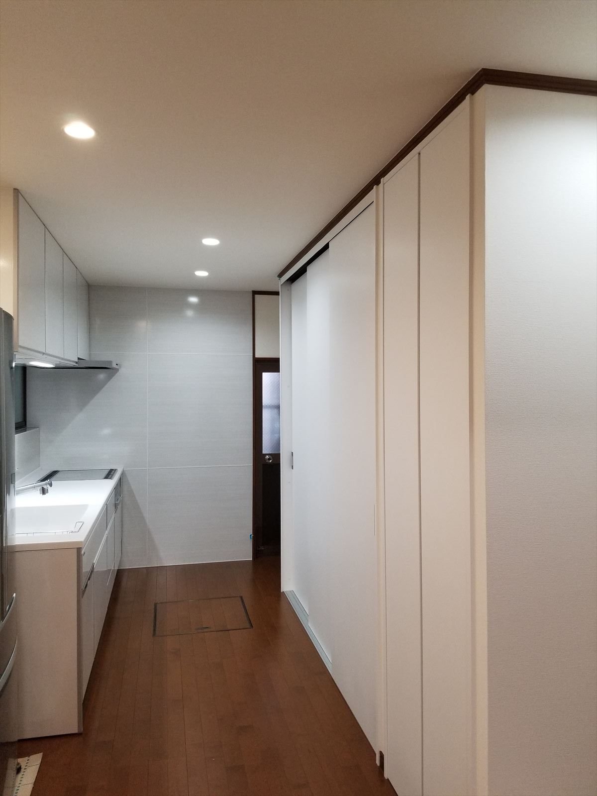 | ご提案内容 | 以前はL型のキッチンと食器棚を並べていましたが、I型のキッチンと天井までの高さの収納建具に取替しました。照明はペンダントからダウンライトに取替えた所空間が広く感じられるようになりました。 トイレの背面の壁の解体時、階段下にデッドスペースがあったので工事中にプランを変更し廊下側に小さな収納扉を取付け収納スペースにしました。 お客様と楽しくリフォーム計画を進めることができとても勉強になりました。 ありがとうございます。 |