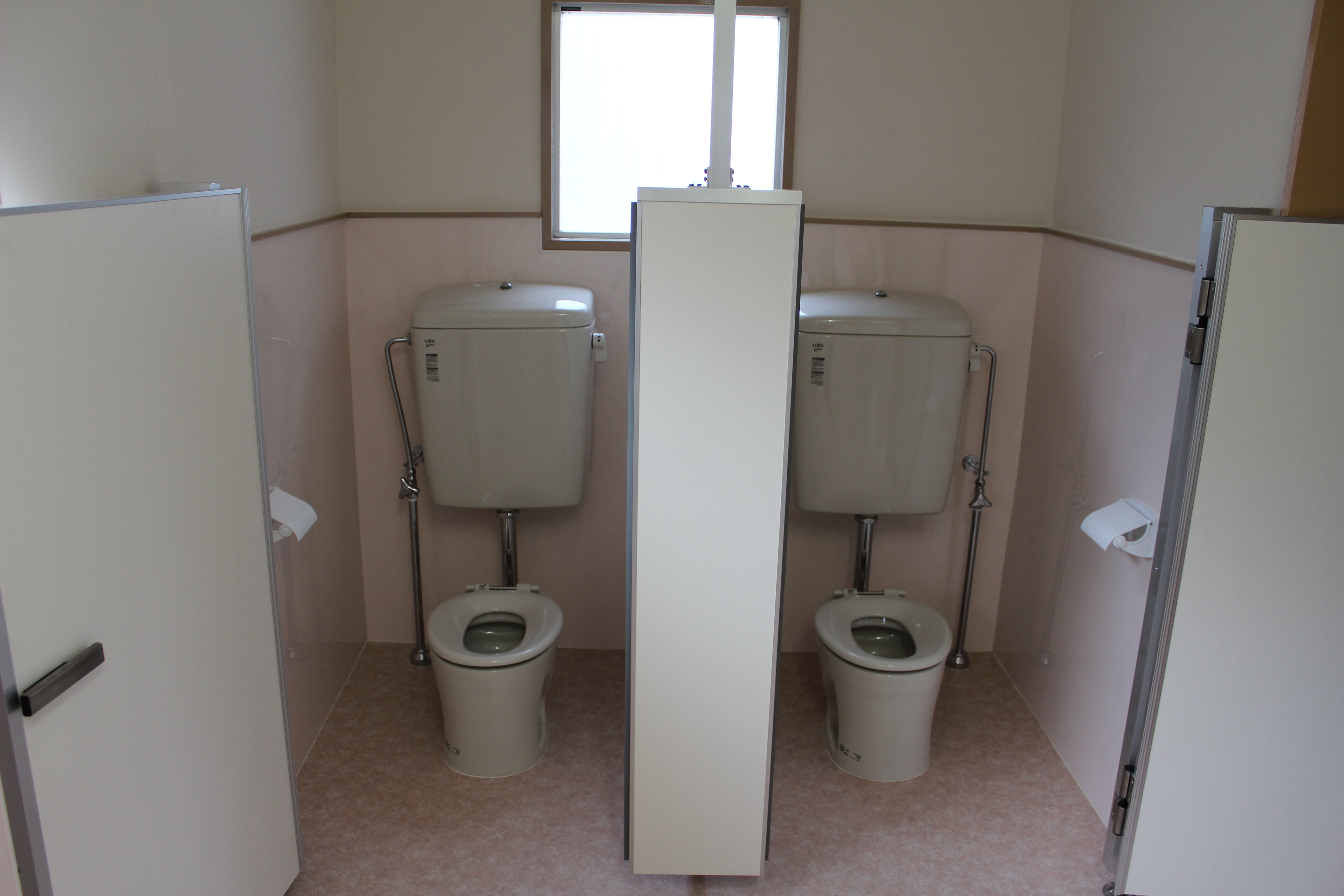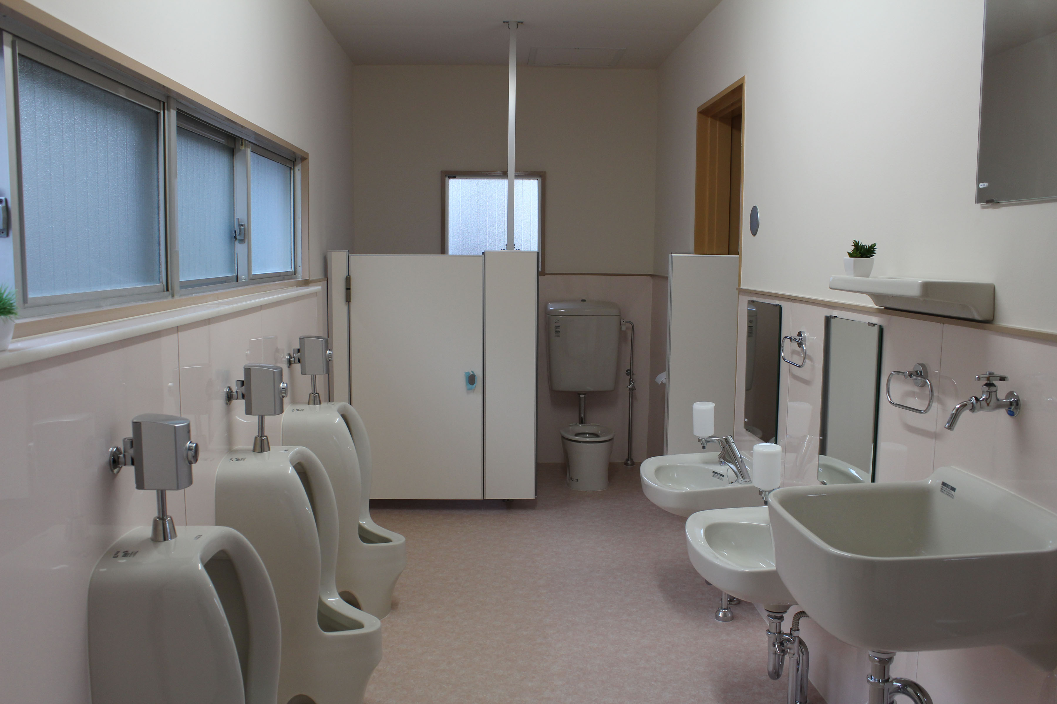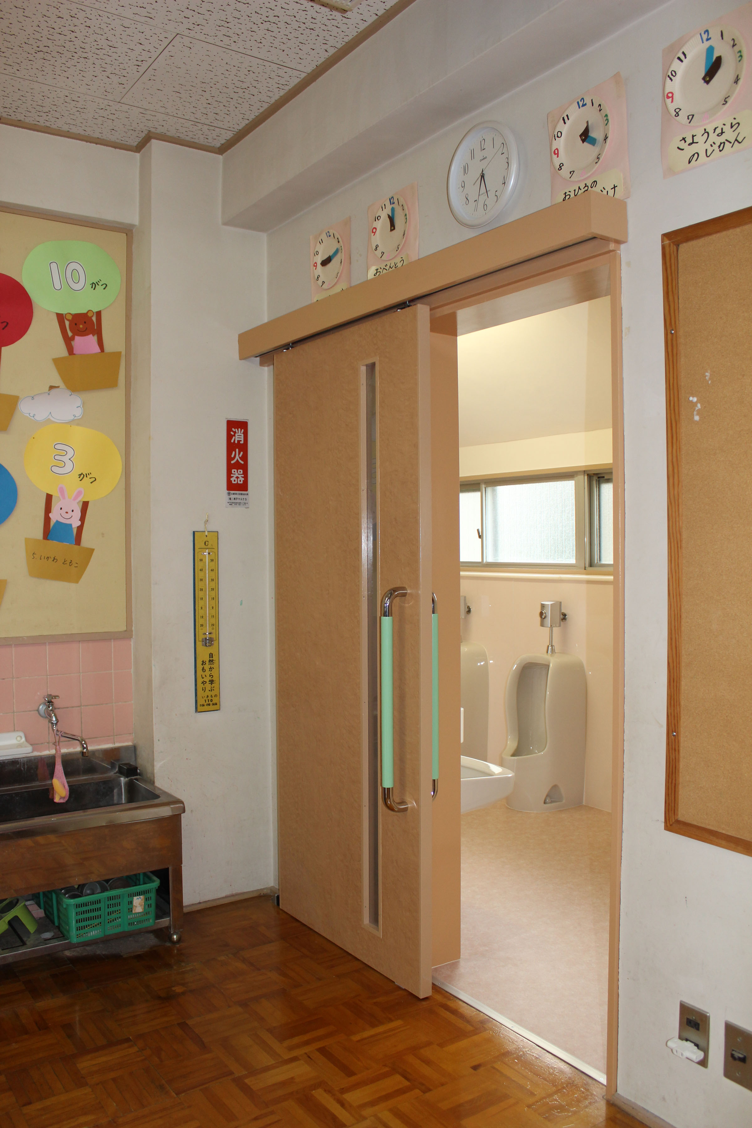 | ご提案内容 | 排水管からやり替え、そうじ用のシンクも新たに取付しました。毎日、大勢の子供が使用する場所だからこ、いつも綺麗にしておきたいですよね!園児さんにとってストレスのない空間となるよう和式の便器から子供用の便器に変更しました。床をタイルからあたたかいイメージのクッションフロアにしました。子供たちが安全に使用できるよう配慮しました。以前は、開き戸であったため、園児さんが勢いよく扉を開けるときには心配でしたが、引戸にし段差もなくすことで安全な出入りができるようになりました。 |