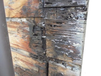 | ご提案内容 | 大雨後にクロスのシミ以外にも柱や梁が濡れていることを発見されていた為、該当箇所の屋根瓦や壁を機材を使い調査しました。晴天時にサーモグラフィーカメラで見たところ中央部の青色(低温部分)が発見。お客様のご了解をいただき、壁のモルタル部分を解体したところ柱やラス板が長年の雨水の浸み込みにより腐っていることが判明。 |