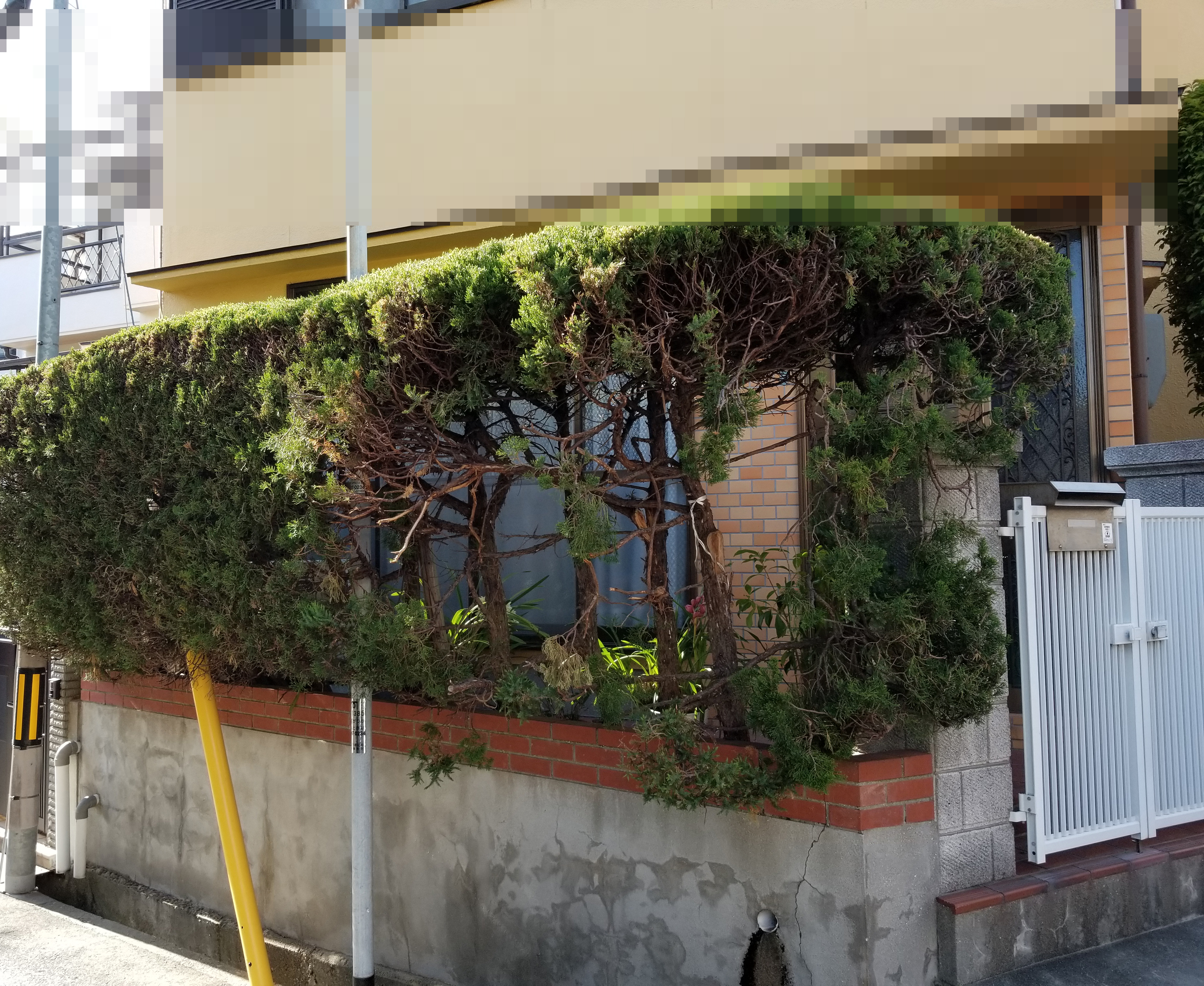 | ご提案内容 | 目隠しの植栽が道路へはみ出すようになったので、伐採後フェンスに取替しました。 ガレージゲートの重いゲートも伸縮ゲートに取替、全体的にすっきりしたエクステリアとなりました。 溶接しているゲートの柱は残して、必要最低限の工事をしています。 |