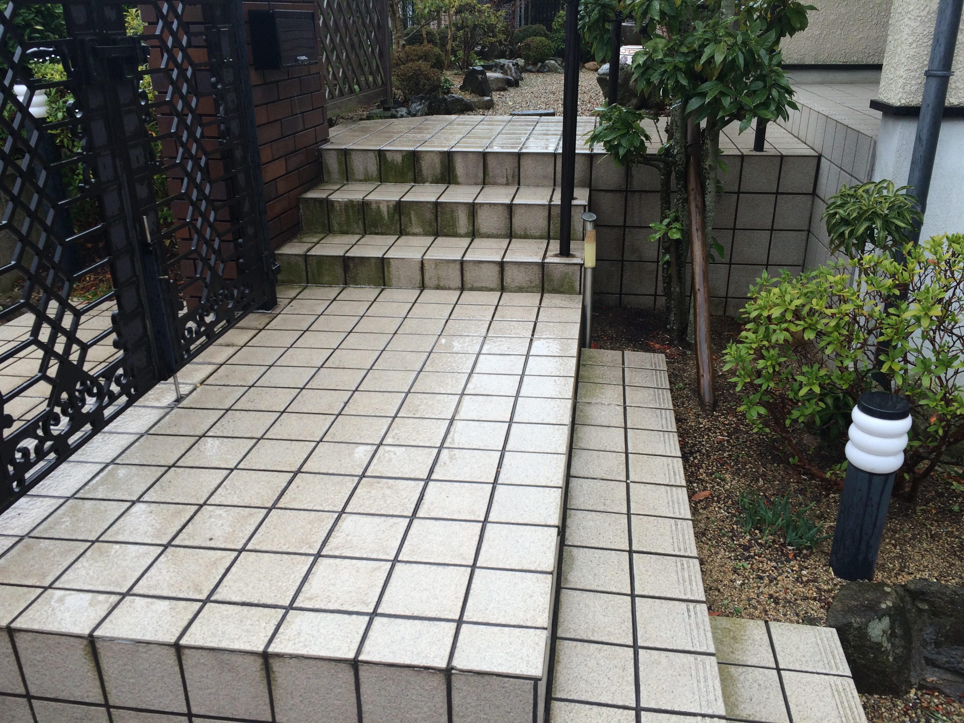 | ご提案内容 | 時折ご子息が帰省される際に利用されるとのことでしたが、空き家ならではの弊害に悩まされていました。ポーチの床タイルや駐車場の土間コンクリートはまっ黒に汚れ、そこへ駐車場に面した庭の斜面から、雨の日に土が流れてきて掃除が大変でした。さらにコウモリが巣をつくり糞害にも悩まされていました。そのような大変な状況でしたが、弊社の豊富なメンテナンスの経験ですべて解決させていただき、見た目もきれいになり、斜面も安全に歩行できるようになりました。まっ黒だったコンクリートは業務用の高圧洗浄機でほぼ元の状態に戻りました。斜面は透水性のある景観防草材を敷き詰め、既存の庭とも違和感のない自然な仕上がりとなりました。防草材の下地には砕石を敷き固めているので斜面でも安定した歩行感が得られます |
